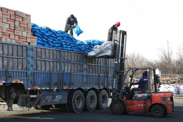 哈密市藍色火宴新能源開發(fā)有限責任公司工人在裝載銷售產(chǎn)品。( 記者 邢寶玉)