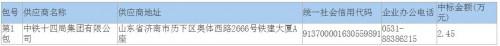 本項目中標供應(yīng)商為:中鐵十四局集團有限公司、中鐵建發(fā)展集團有限公司、中節(jié)能國禎環(huán)??萍脊煞萦邢薰韭?lián)合體;中標金額的單位為元/立方米,本項目中標金額為污水處理服務(wù)費綜合單價2.45元/立方米。